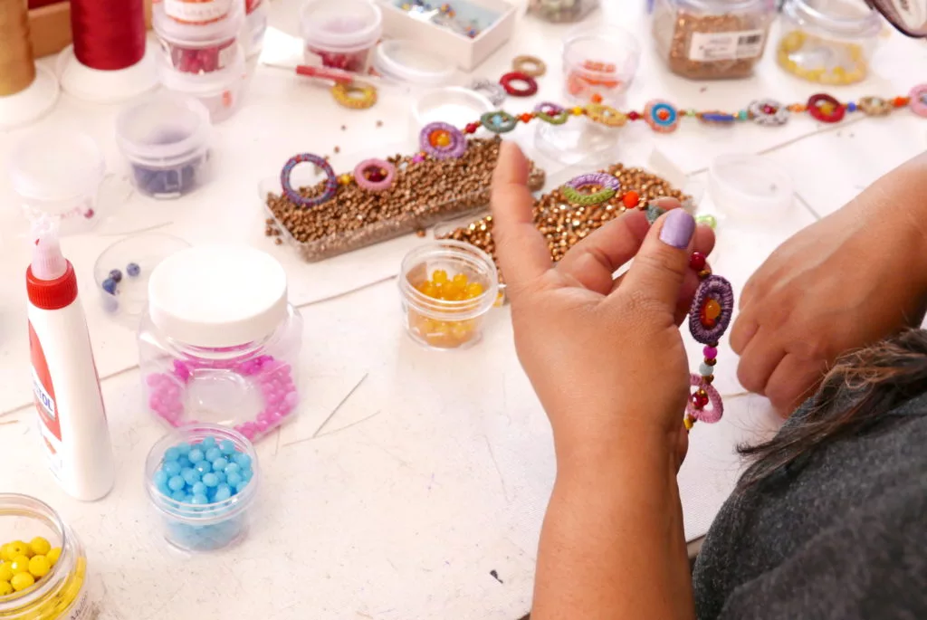 Depuis 2014, nous avons travaillé à créer une synergie entre la technique originale inventée par Sylvie et le savoir-faire manuel de nos ouvrières en matière de broderie, crochet, couture. Nous recrutons et formons des femmes originaires de quartiers affectés par la fracture sociale et la ségrégation territoriale. Dans ce contexte, la formation à un ouvrage hautement spécialisé et l’accès à un emploi de qualité sont autant de leviers pour sortir de l’informalité, dans une logique d’empowerment.